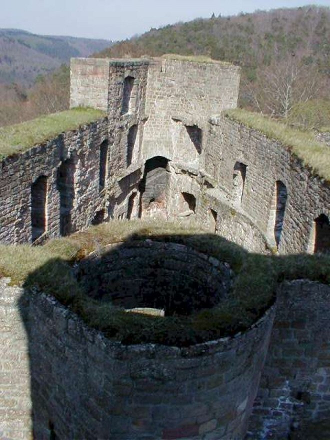 based on the structural components, a period between 1150 and 1200 can be supposed when one considers the restoration of the stone fortress as the earliest date of the castle's construction (1168). The upper castle, or keep, was built on a 12 meter high shelf of rock, and has a unique seven sided high tower. The Castle is well preserved. From atop the tower platform one has a good view over it, it's lands, and far parts of the Palatinate forest.